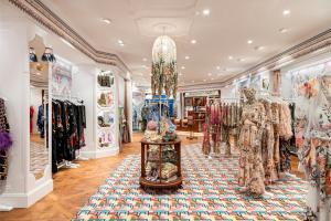 Магазин Short Hills площадью 2000 квадратных футов украшен мозаичным полом ручной работы, коврами на заказ, баром с шампанским и мягкими стульями, а также винтажным поездом, украшенным изображениями из путешествий основателя и креативного директора компании Камиллы Фрэнкс. “Я стремлюсь обеспечить незабываемые впечатления как для первых посетителей, так и для постоянных клиентов, некоторые из которых были со мной с самого начала”, — говорит Фрэнкс, основавшая свой бизнес в 2004 году. В центре внимания — фирменные принты Фрэнкса, нанесенные вручную искусными мастерами.