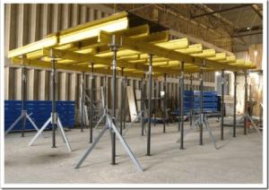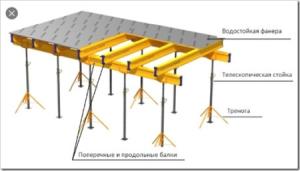Опалубка на телескопических стойках в свою структуру включает палубы из фанеры, устойчивой к воздействию влаги и унивилок для укладывания металлических либо же деревянных балок, треног для фиксирования в вертикальном положении стоек, а также стойки-домкраты с регулируемой высотой в 1,7 – 5,5 метров.