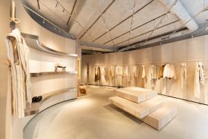 Эксклюзивные произведения искусства контрастируют с более индустриальными элементами, такими как алюминиевые светильники, мебель из матовой стали и необработанные детали из латуни. Примерочная, расположенная в задней части магазина, отделана фетром табачного цвета другого оттенка, который перекликается с коллекциями одежды.