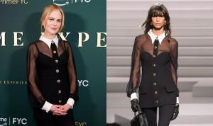 Кидман придерживалась этой тенденции в своем образе, который включал полностью черный прозрачный топ, под который она надела лифчик с фестончатыми деталями. Изделие также отличалось белым воротничком с декоративным рисунком, который сочетался с манжетами.