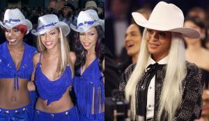 Пристрастие Бейонсе к западной одежде появилось еще до выхода ее первого кантри-альбома “Cowboy Carter». Будучи уроженкой Хьюстона, певица-суперзвезда никогда не отказывалась от своих корней, представляя Техас и принимая кантри-культуру штата. После выхода ее восьмого альбома WWD представляет каталог модных образов Бейонсе для девушек-ковбоев. Выступая вместе с Destiny’s Child в лондонском Гайд-парке в 2000 году, Бейонсе надела красный топ-бандану и украшенные джинсы с низкой посадкой и необработанной линией талии. Бейонсе часто сочеталась со своими подругами по группе, Келли Роуленд и Мишель Уильямс, во времена их участия в Destiny’s Child. Мать Бейонсе, Тина Ноулз, создала многие костюмы для группы, в том числе это трио из кобальтовой замши 2001 года. Наряд Бейонсе состоял из топа с бюстгальтером и миди-юбки с низкой посадкой и асимметричным подолом, которые часто использовала Тина Ноулз.