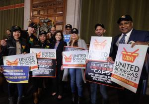 Губернатор Нью-Йорка выступает на митинге в поддержку предложения о краже розничной торговли на сумму 45 миллионов долларов